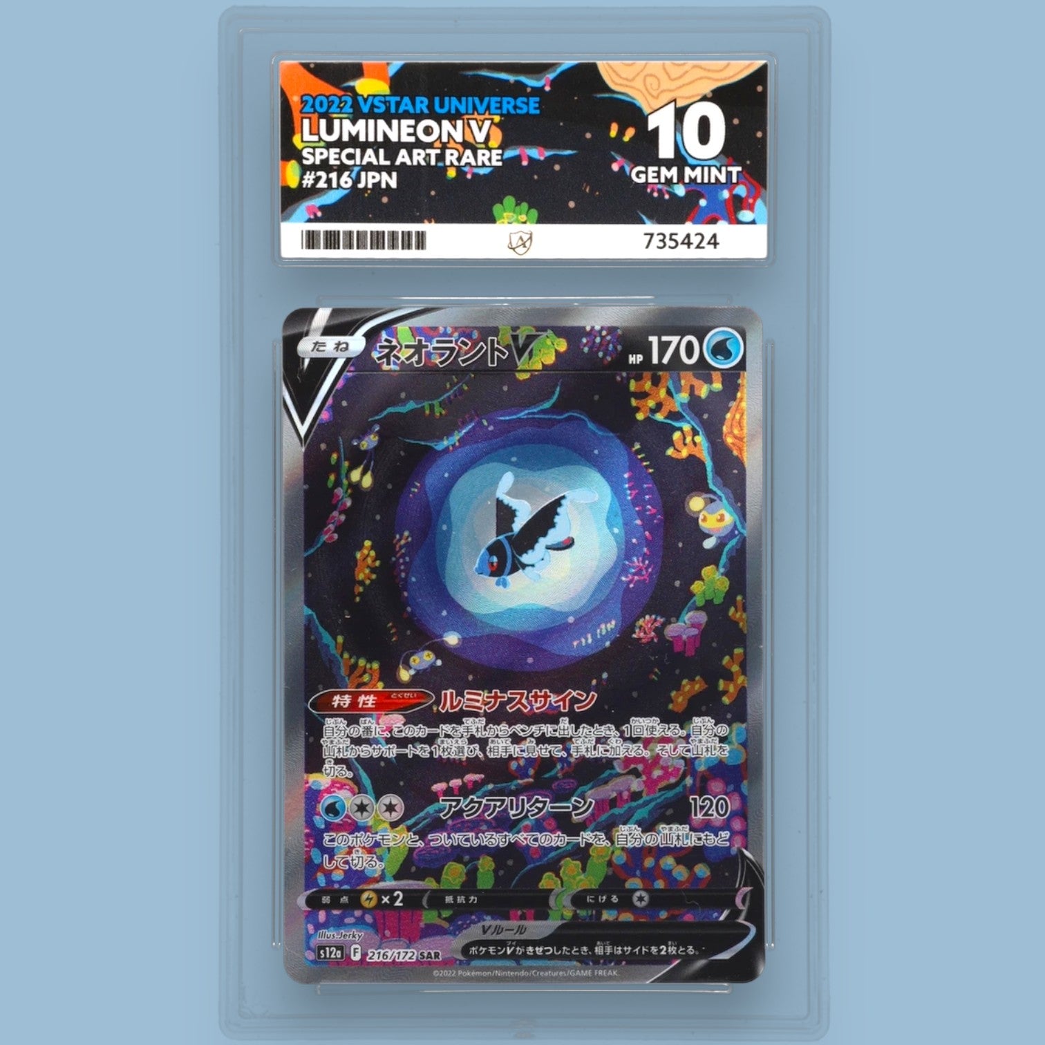 Upgrade your Pokémon TCG collection with this ACE Graded 10 copy of Lumineon V (216/172) from the 2022 VSTAR Universe high-class Japanese set. Featuring breathtaking full-art artwork and premium Japanese print quality, this Special Art Rare (SAR) card is presented in pristine, gem-mint condition.