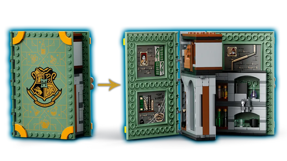 Interactive Playbook Design: The LEGO Hogwarts Moment set transforms into a miniature Potions classroom when opened, capturing the atmosphere of Snape's Hogwarts dungeon classroom. When closed, it resembles a spellbook, making it easy to store and display, perfect for fans of both LEGO Harry Potter sets and magical play experiences.